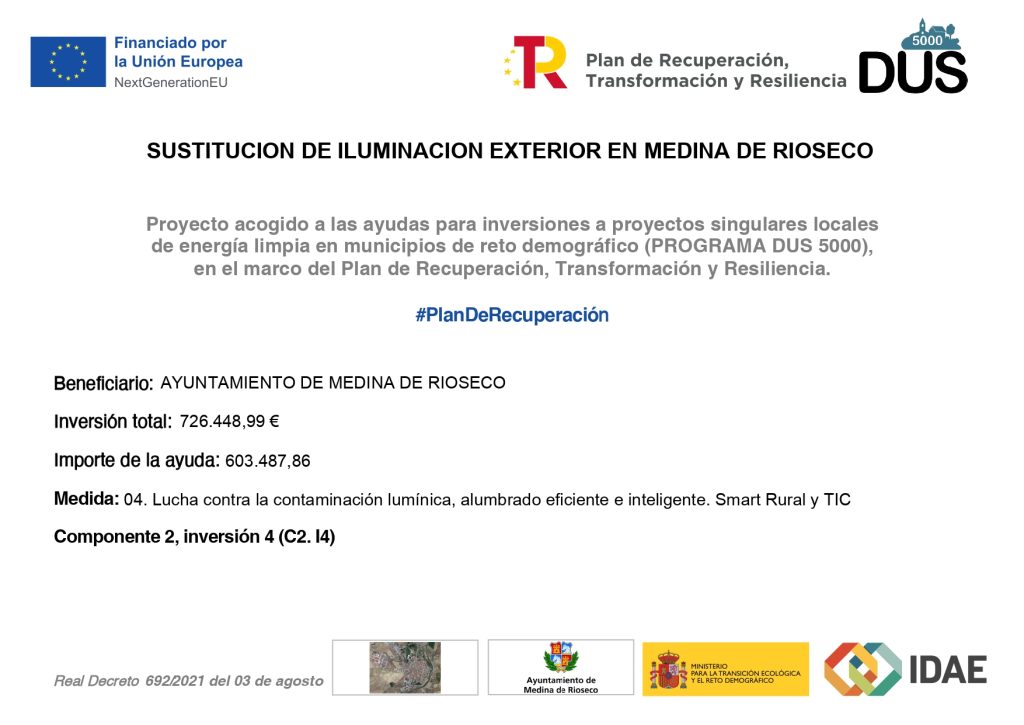 El Ayuntamiento de Medina de Rioseco ha puesto en marcha un ambicioso proyecto de modernización de su alumbrado público exterior, con el objetivo de mejorar la eficiencia energética, reducir la contaminación lumínica y adaptar las instalaciones a las exigencias normativas actuales. Esta actuación, que afecta a todo el término municipal, se enmarca dentro del Programa DUS 5000, y cuenta con una subvención del 85% concedida por el Instituto para la Diversificación y Ahorro de la Energía (IDAE), alcanzando una ayuda total de 603.487,86 euros.